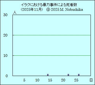 | 11.22 | メイサン州サラム地区で武装集団の銃撃により電力省の局長1人死亡,治安当局発表。(NINA) | [パレスチナ情勢] ガザ保健省(GMH)が過去48時間のガザ地区へのイスラエル軍の攻撃によるパレスチナ人の死者は27人,負傷者は113人,2023年10月7日以降のイスラエル軍の攻撃によるガザ地区のパレスチナ人の累計死者数は69,753人(うち180人は行方不明者を死亡と認定),負傷者は170,946人と発表。(GMH) ガザ地区各地へのイスラエル軍の攻撃によりパレスチナ人少なくとも24人死亡,83人負傷,各病院と保健当局発表,中部アルアウダ病院近くの民家への空爆により少なくとも3人死亡,11人負傷,中部ヌッセイラート難民キャンプで7人死亡,子ども含む16人負傷,中部ディル・アルバラハで女性1人含む3人死亡,イスラエル軍は南部で部隊への発砲があったための報復攻撃と主張し,ハマス幹部5人を殺害したと発表。(AP)(R) |