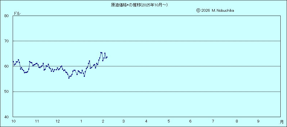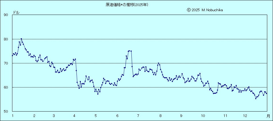 - *ニューヨーク商業取引所のWTI(West Texas Intermediate)原油の1バレルあたりの先物価格(期近)の終値。